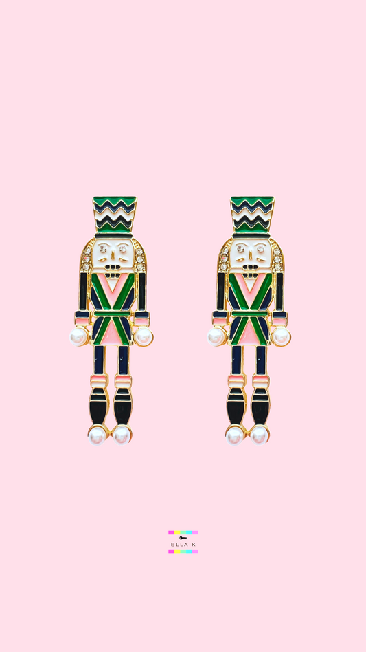 Green & Pink Enamel Nutcracker Christmas Earrings