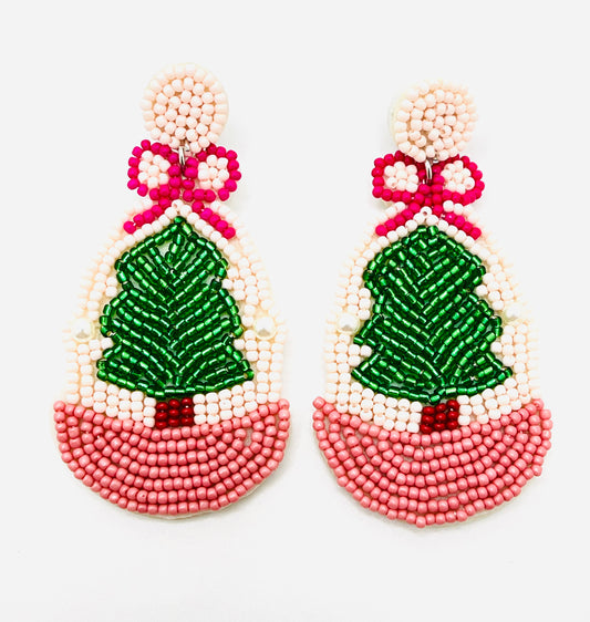 Pink Coquette Bow Christmas Tree Earrings