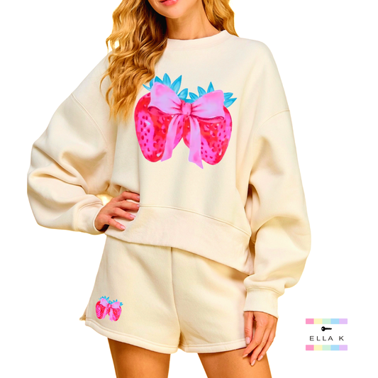Strawberry Coquette Bow Watercolor Sweatshirt & Shorts Set