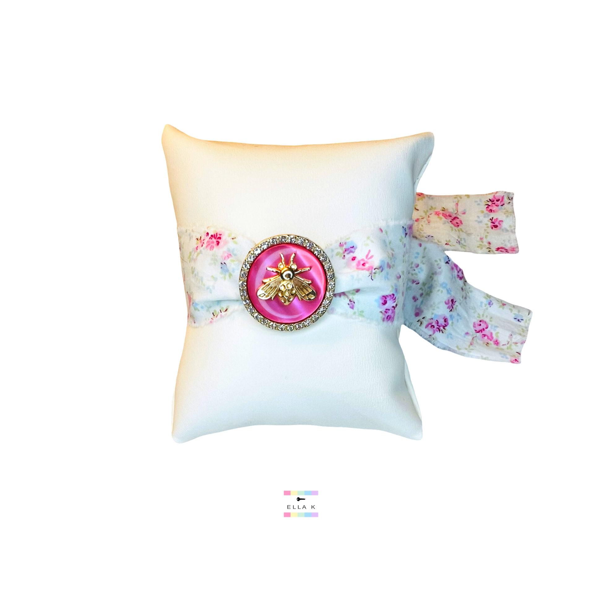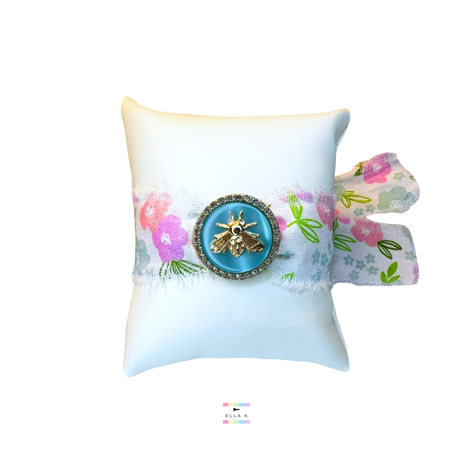 This bracelet features a golden bee charm. The golden bee is set on an opal look button with delicate rhinestones, paired with your choice of a soft floral fabric & custom tiny bee charm.