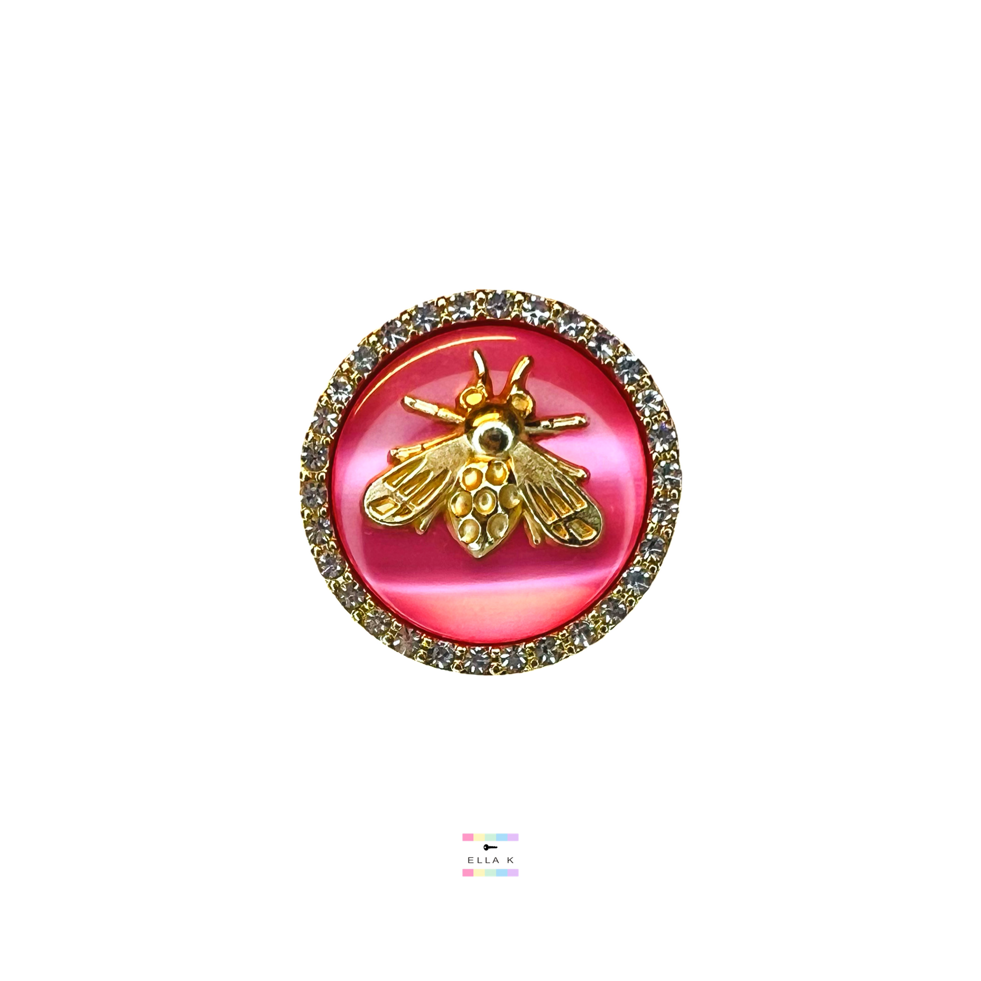 - Centerpiece: 3D metal rhinestone button charm featuring a raised gold bee, resin opal look base & sparkling rhinestone border. Your choice of color for a personalized touch.
