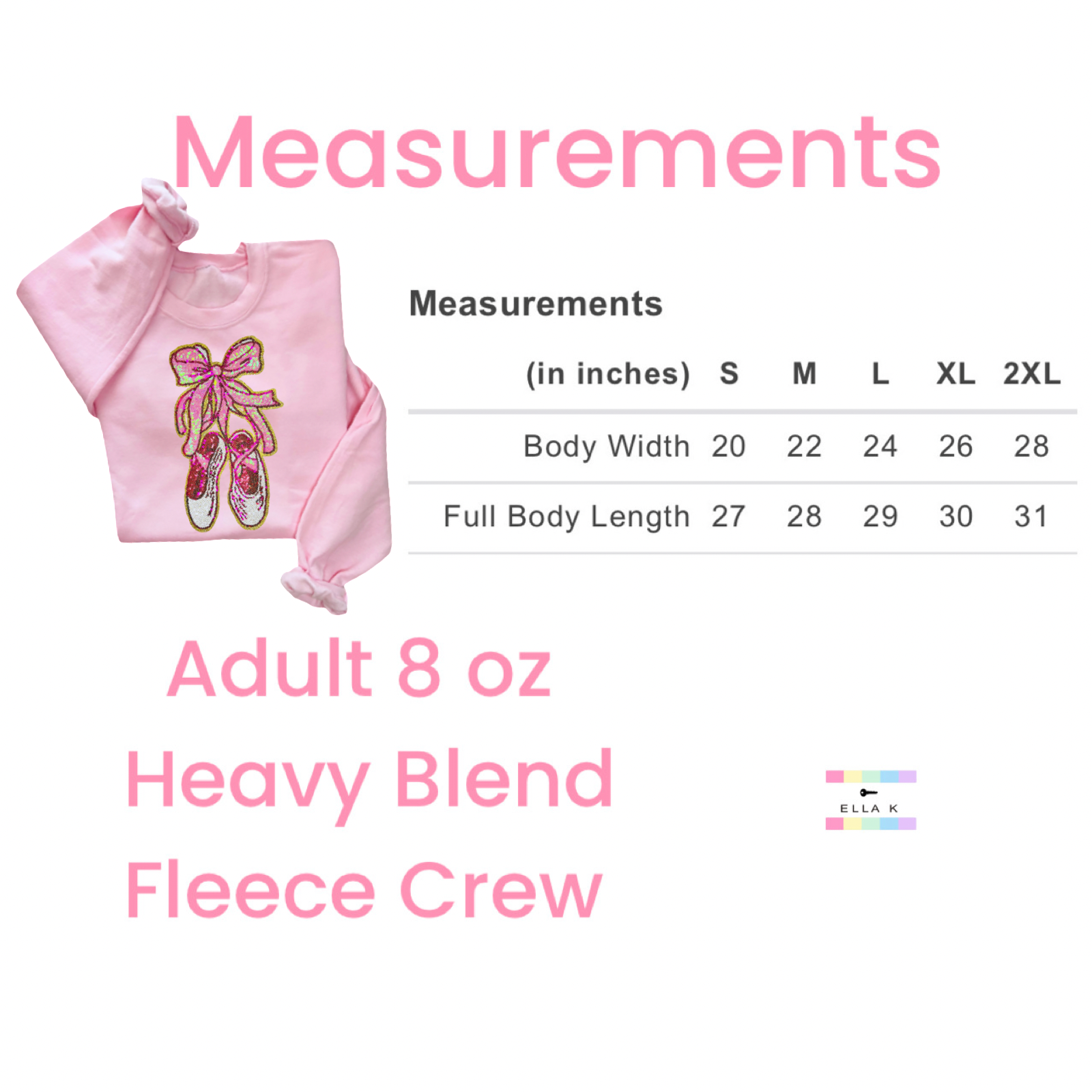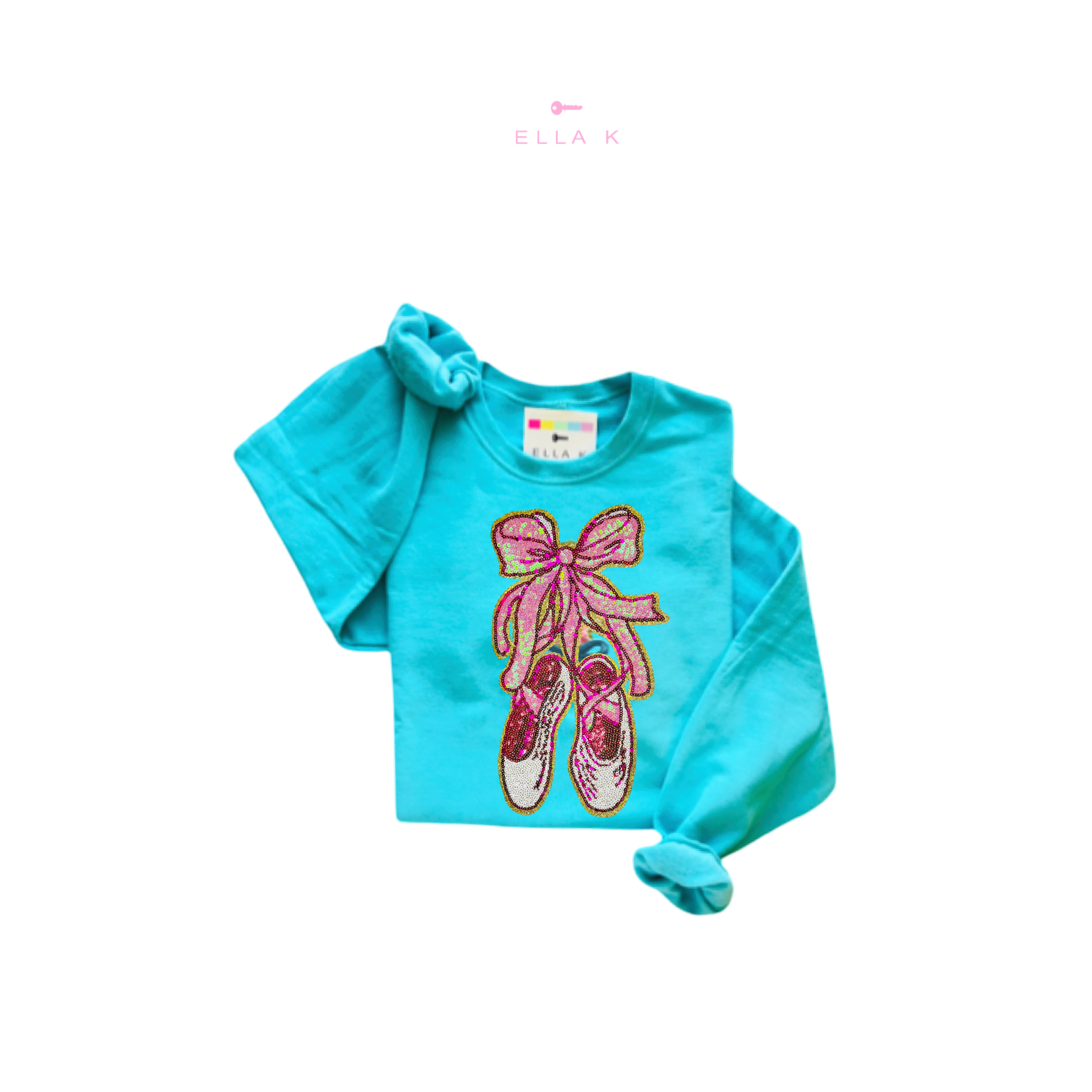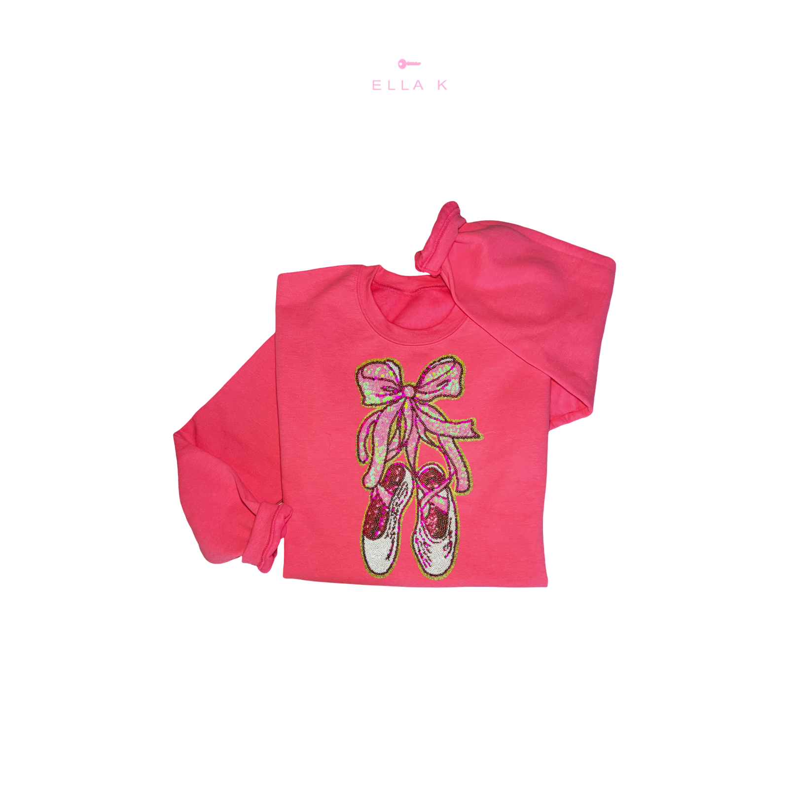 Perfect pink sequins & gold glitter patch of a cute pair of ballerina slippers with curly ribbons tied into a coquette bow. The intimate girly cozy pullover.