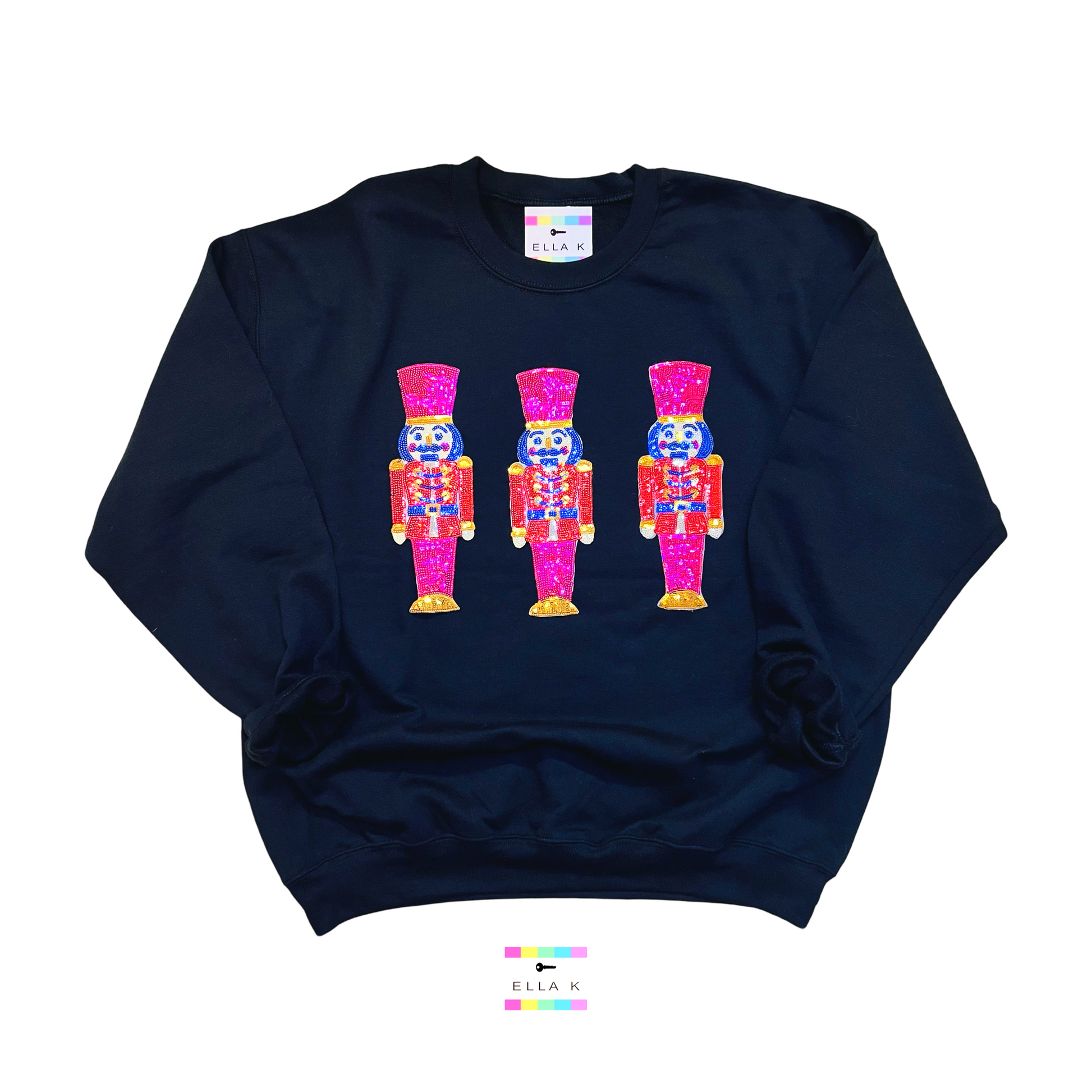 Soldier Nutcracker Trio Sequin Appliqué on a Black Gildan Sweatshirt. Made to order. Sequin Patches are pressed onto the shirt using an industrial heat press.