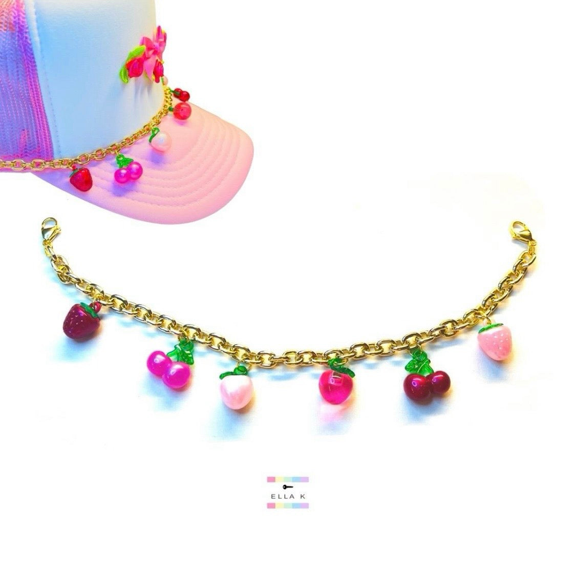 3D Resin Fruit Charms (apple, cherry, strawberry) attached to a chunky gold link chain adds just the right amount of sweetness to your favorite trucker hat.
