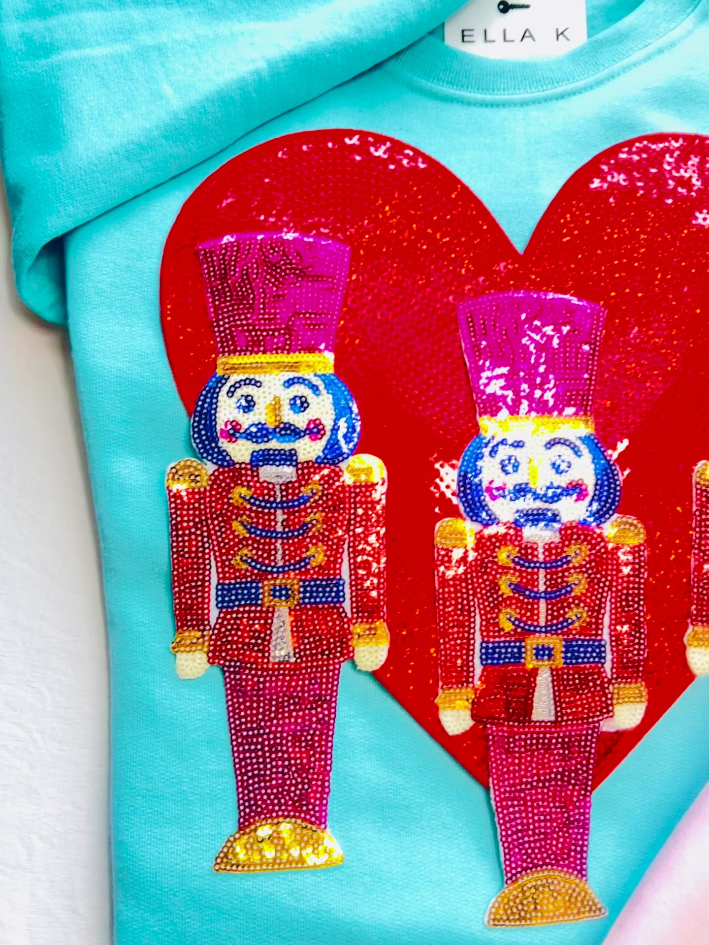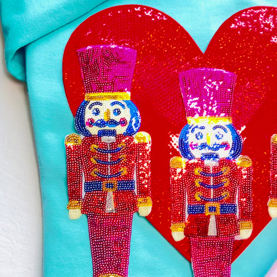 Nutcracker Love Christmas Sweatshirt. Made to order. Trio Sequin Nutcracker patches on an oversized sequin heart patch in your color choice. The patches are pressed onto the shirt using an industrial heat press.