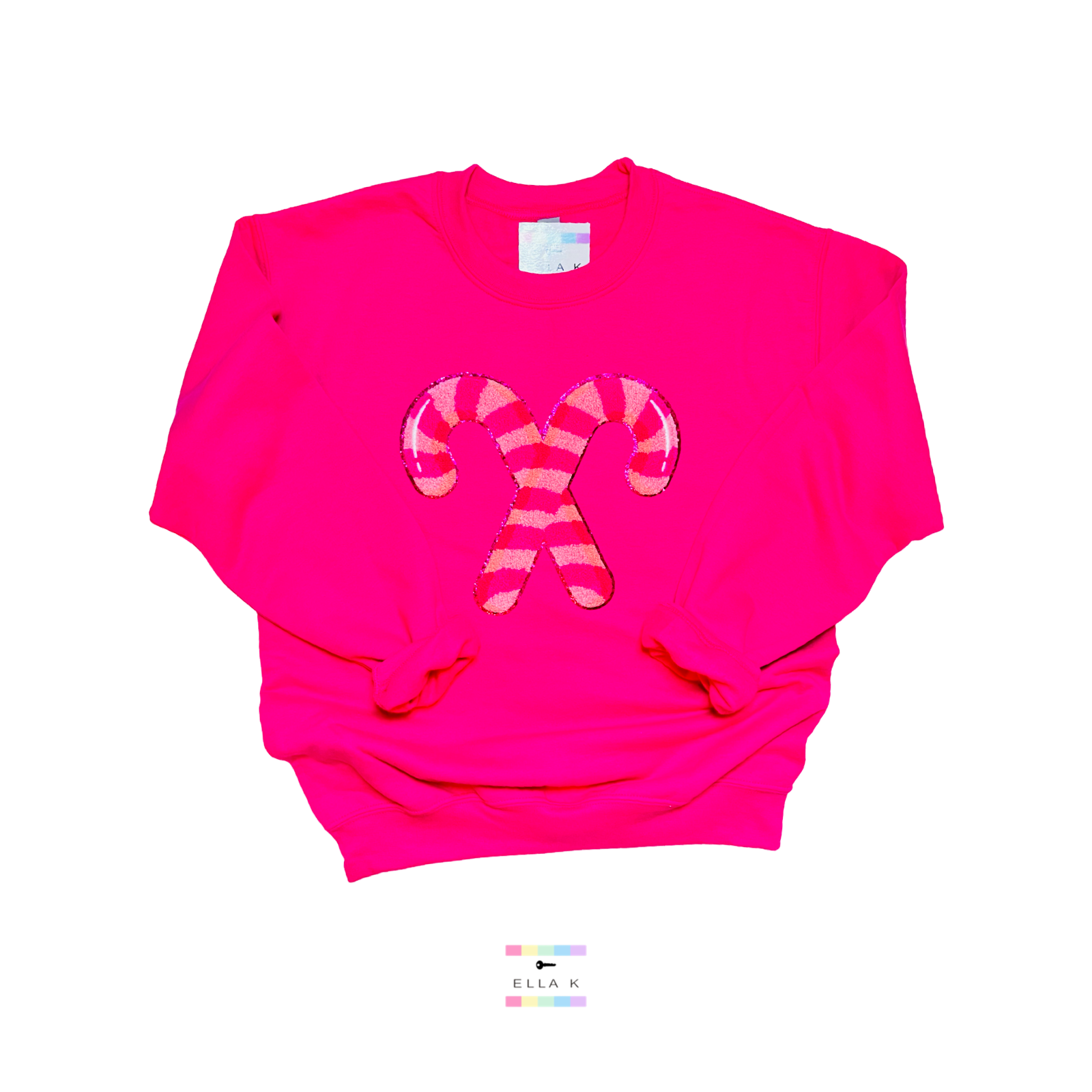 Pink Candy Cane Christmas Sweatshirt. Made to order. The Candy Cane chenille patch is pressed onto the shirt using an industrial heat press.