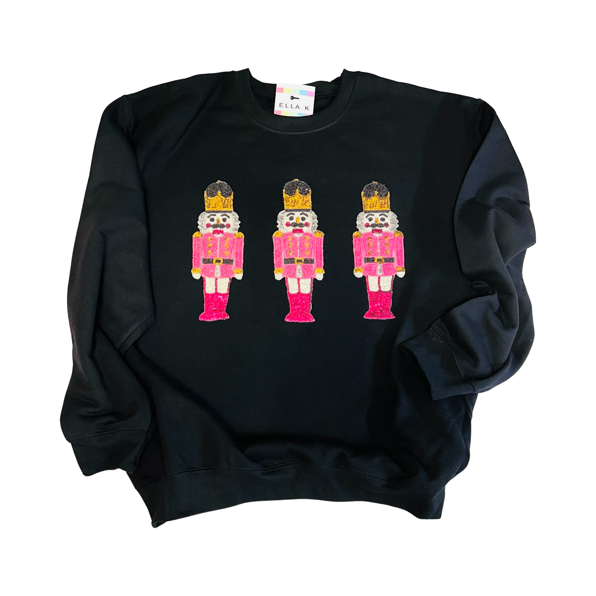 King Nutcracker Trio Sequin Appliqué on a Black Gildan Sweatshirt. Made to order. Patches are applied to shirt using an industrial heat press.