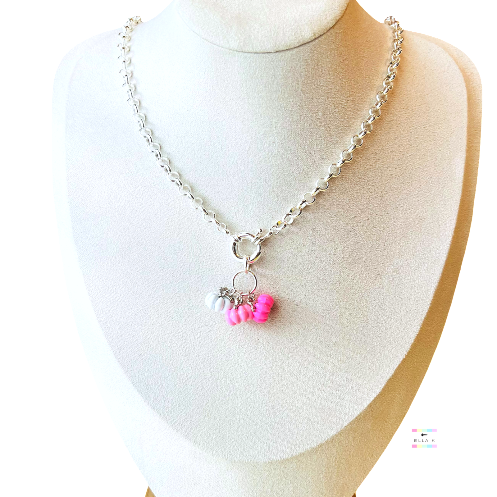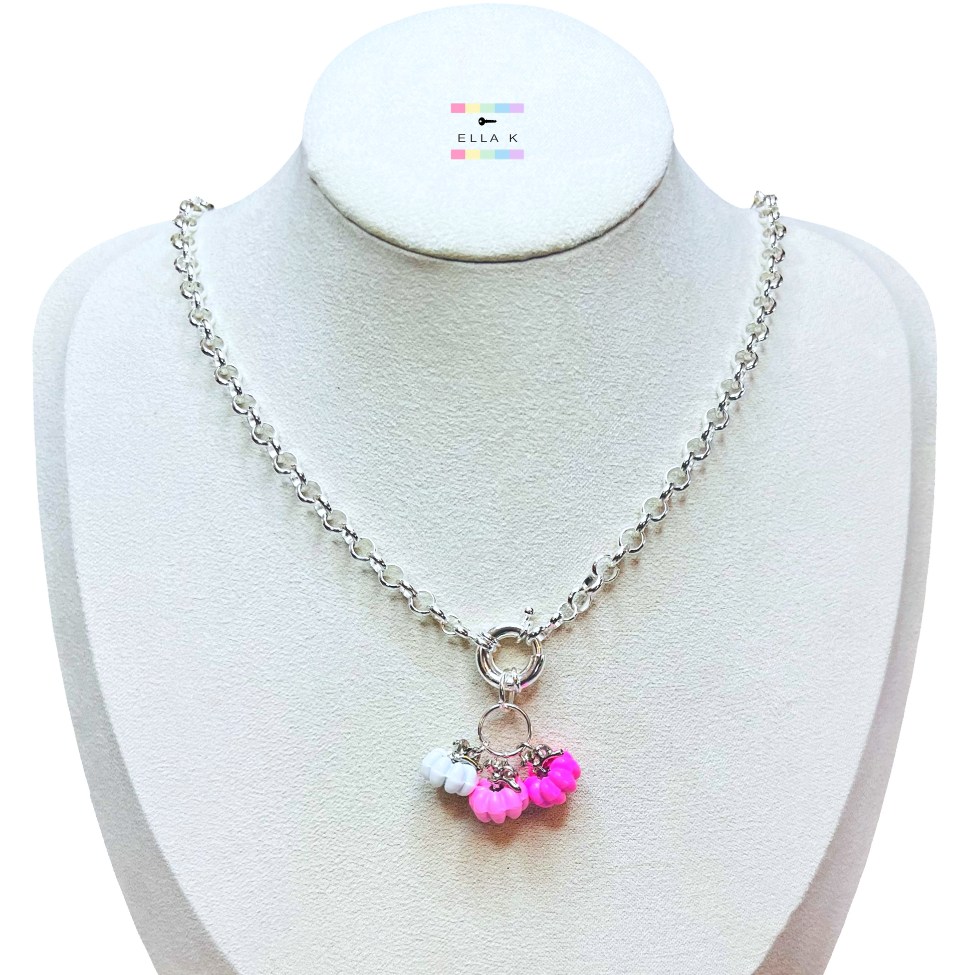 Three tiny pink pumpkins attached to a sailor ring on a silver rolo link chain. The sailor ring allows for easy removal of the pumpkin charms to achieve various looks. Remove pumpkins or add more charms for optional styling possibilities.